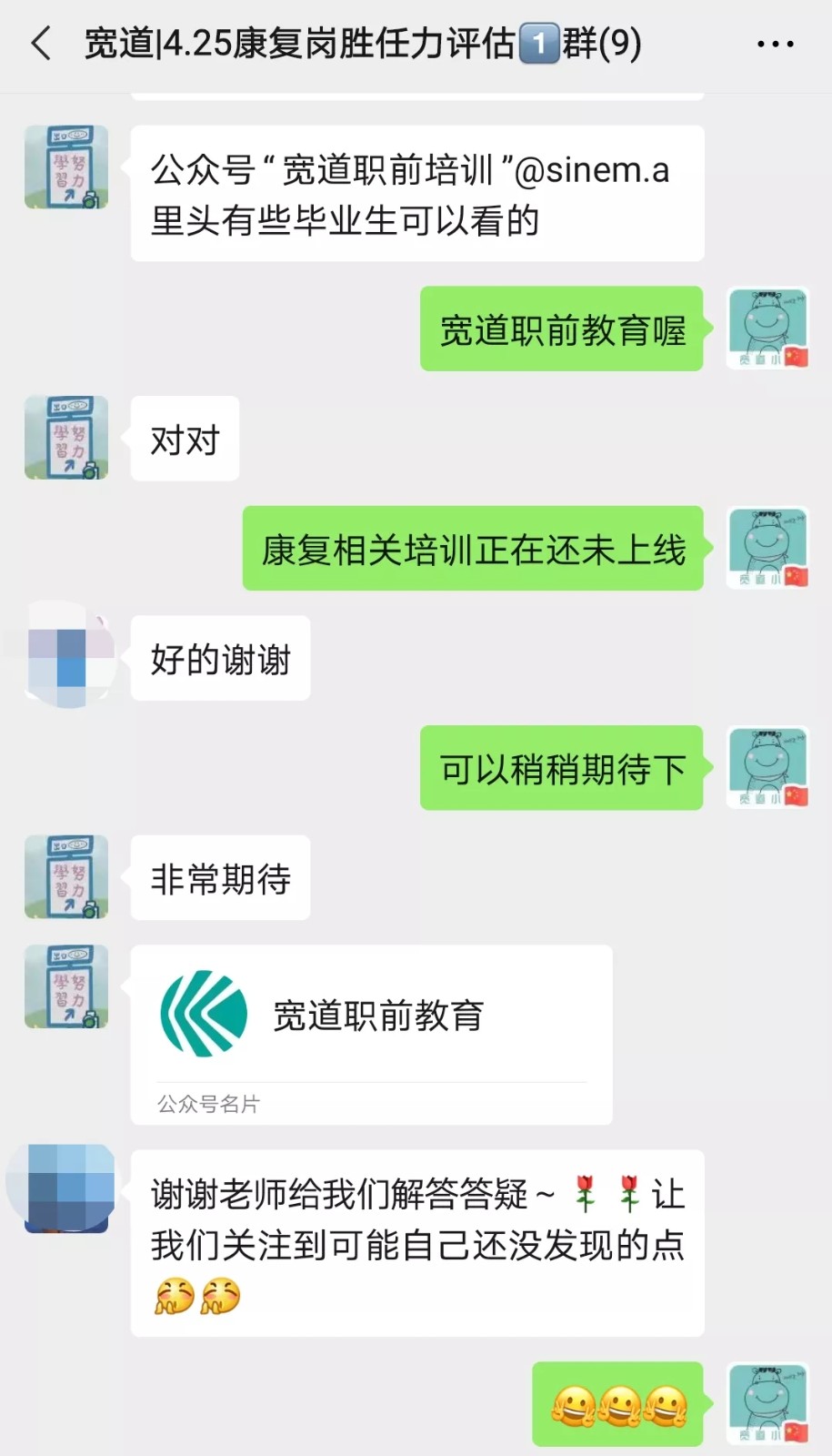 能够解决大家对于岗位胜任力的困惑是我们最大的动力,之后宽道职前将会继续邀请康复岗位专家以及其他岗位专家进行更多不同主题的答疑互动小班线上活动,敬请期待。